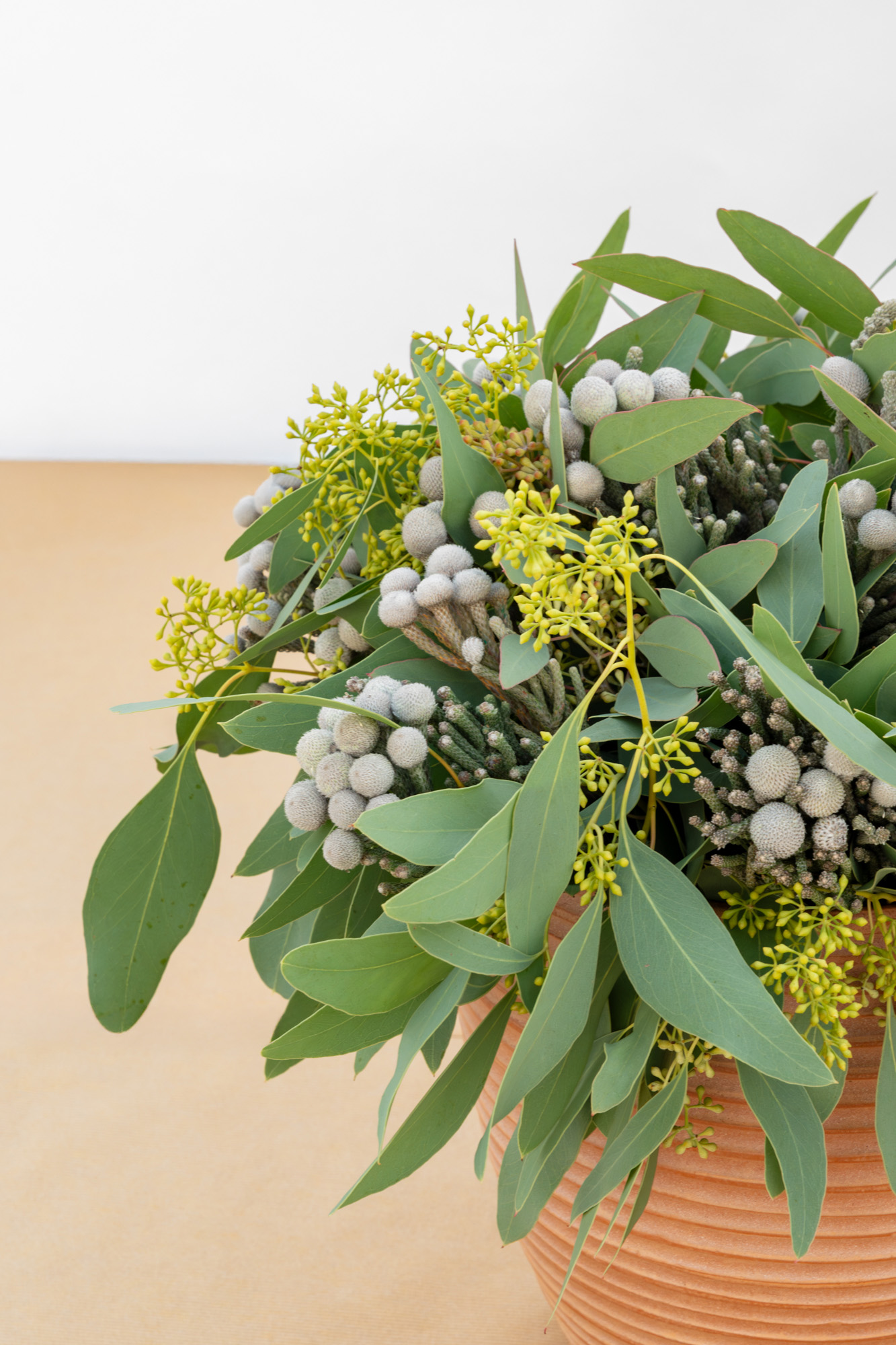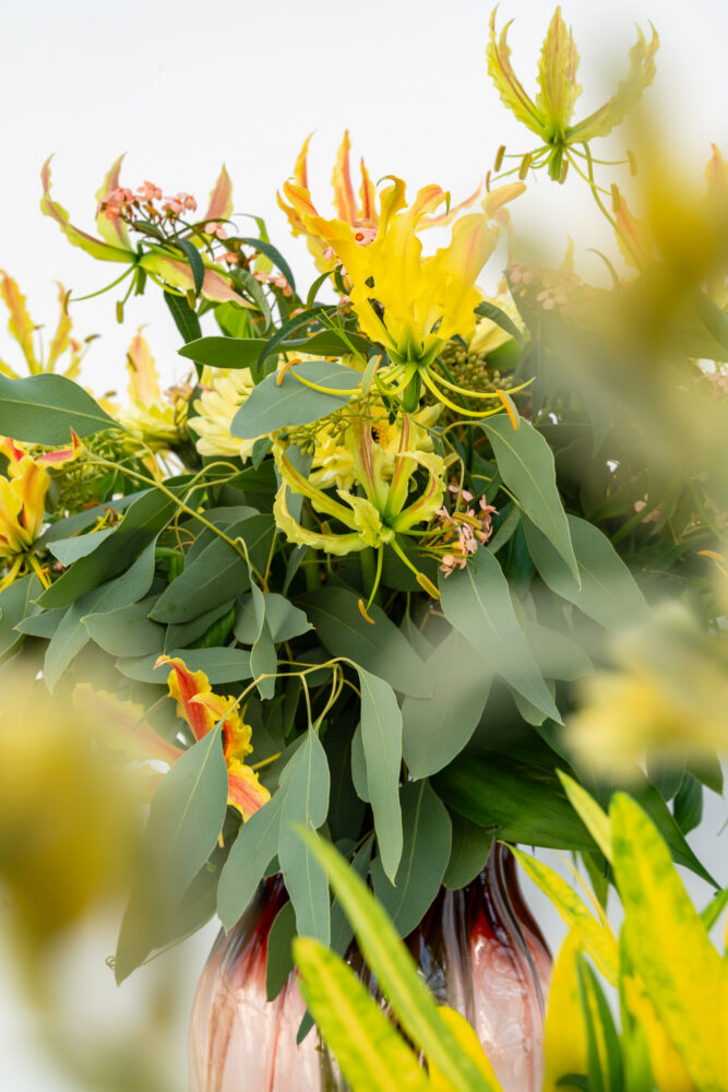 Un bouquet raffiné aux tons pastel dominé par la Gerbera ‘Pastini Spritz’. La Gloriosa Sparkling Strip et l’Euphorbia Pink Baron d’hiver se mêlent dans des nuances de rose et de jaune doux. L’Eucalyptus populnea et ses baies ajoutent de la profondeur et un accent hivernal subtil.