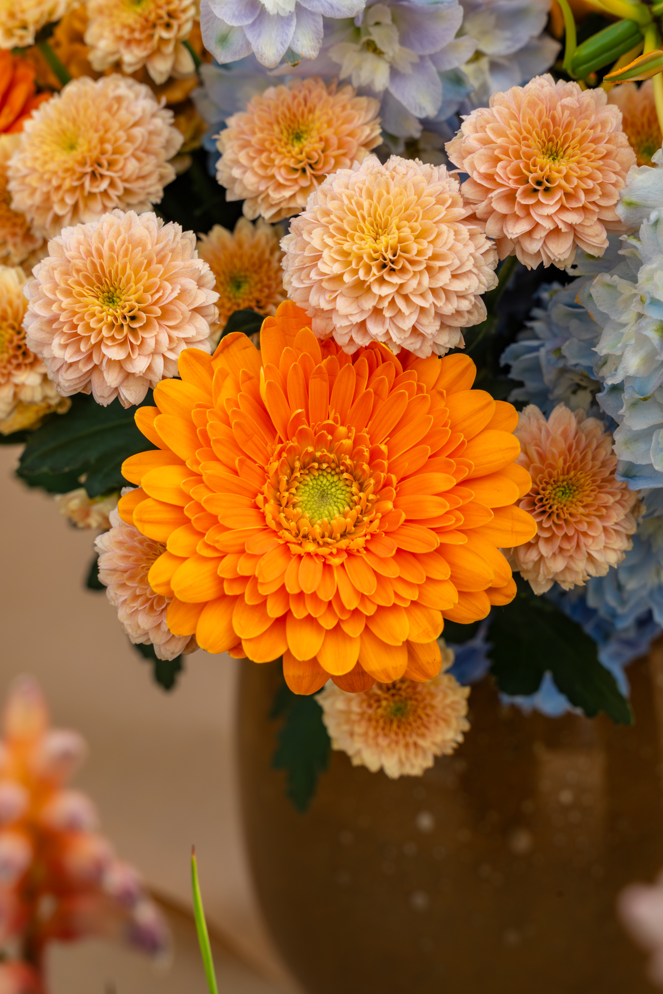 Un bouquet biedermeier classique dominé par la Gerbera ‘Fanta’, au ton orangé éclatant. Elle apporte de la vitalité entre les teintes pêche des chrysanthèmes Santini et la légèreté bleutée du Delphinium. La Gloriosa ajoute une touche exotique et ludique, équilibrant harmonieusement couleur, forme et texture.