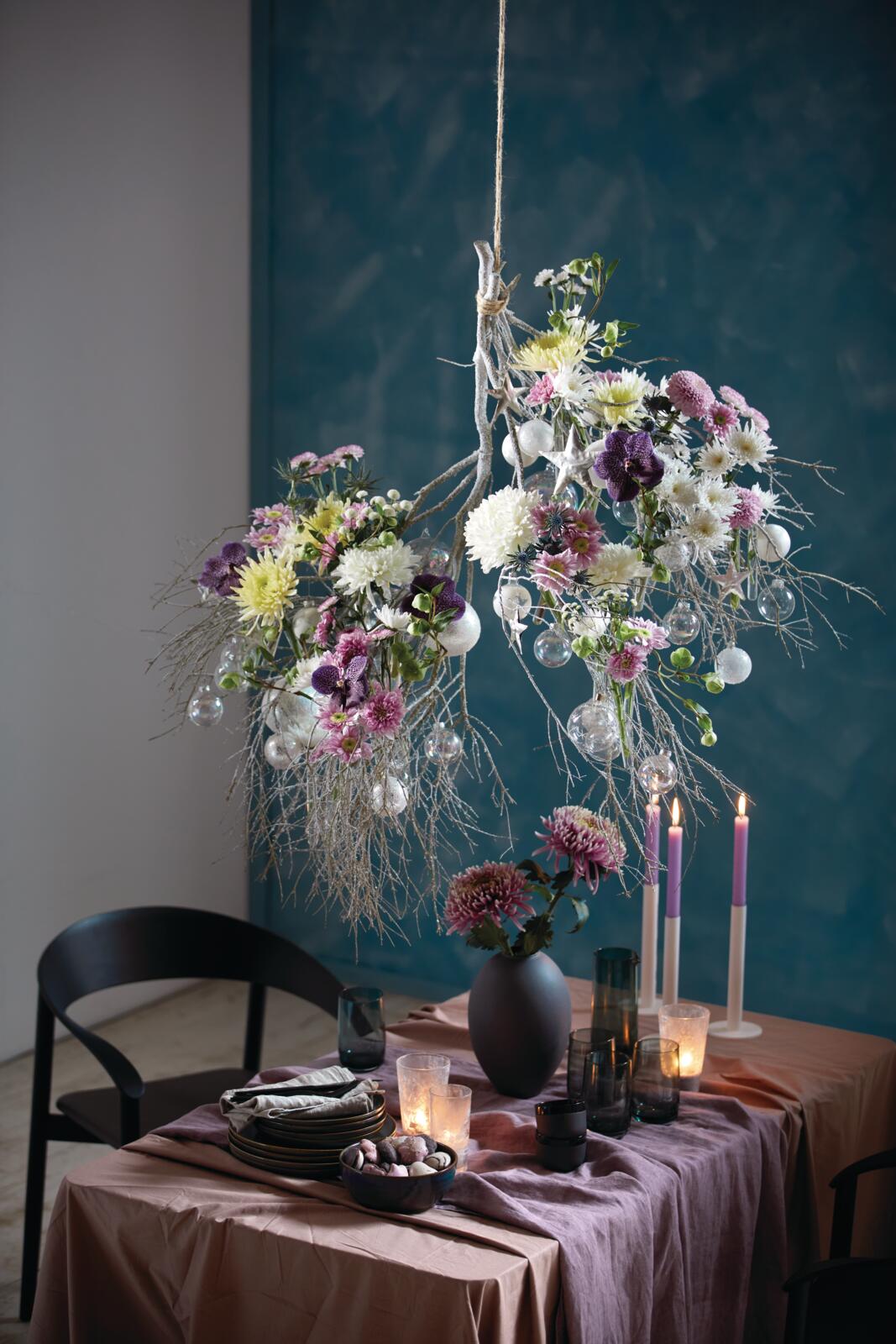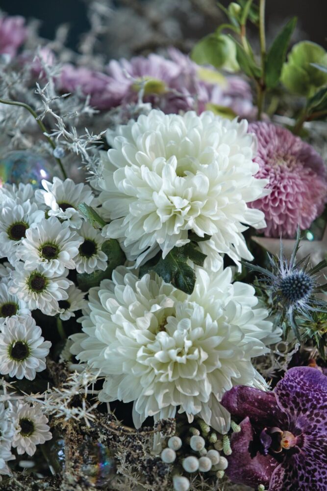 Avec le chrysanthème, vous élèvez littéralement vos créations de fin d’année à un niveau supérieur. Avec des couleurs tendance telles que le bleu glacial, le violet lilas, le rose, le blanc et le crème, qui rappellent la magie des aurores boréales et l’ambiance de paysages gelés. Ajoutez des détails argentés ou des structures en verre, et faites briller vos compositions !