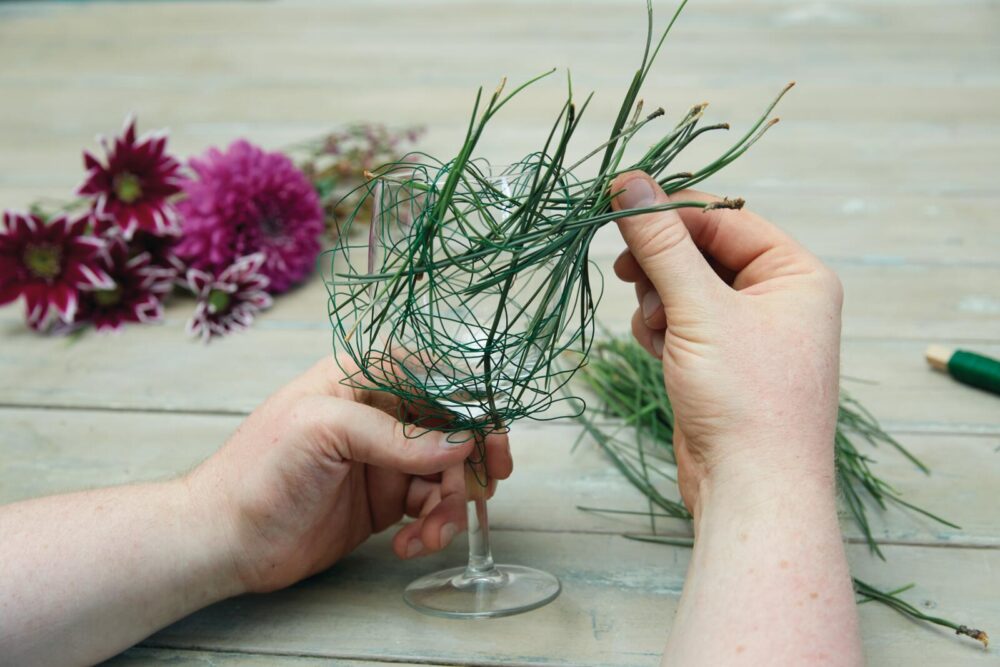 Chic glacé : placez un vase en verre dans un second de plus grande taille et disposez une guirlande lumineuse entre les deux. Utilisez des chrysanthèmes rose pâle et blancs pour recréer parfaitement la tendance Northern Skies.